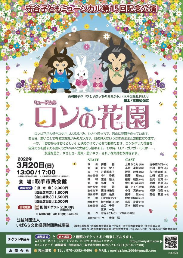 ロンは花が大好きな心のやさしいオオカミ。ひとりぼっちで、岩山に花園をつくっています。ある日、悪いことで有名なガンガや目の見えないウサギのミミと友だちになります。一方、「オオカミはおそりしい」と決めつけている村の動物たちはロンがつくった花園を自分たちを捕まえる罠に違いないを大騒ぎし始めます。その時、ロン・ガンガ・ミミは…。